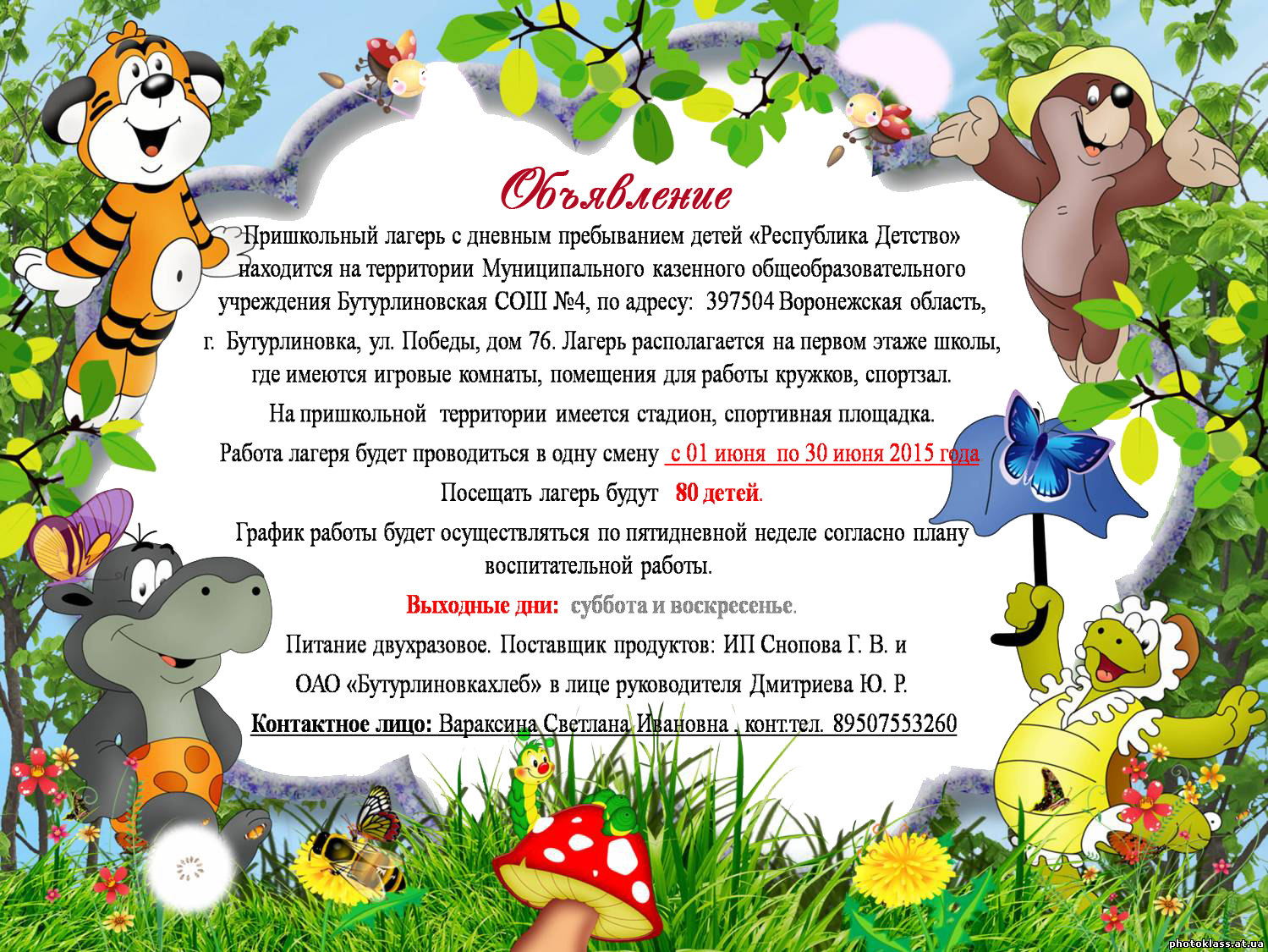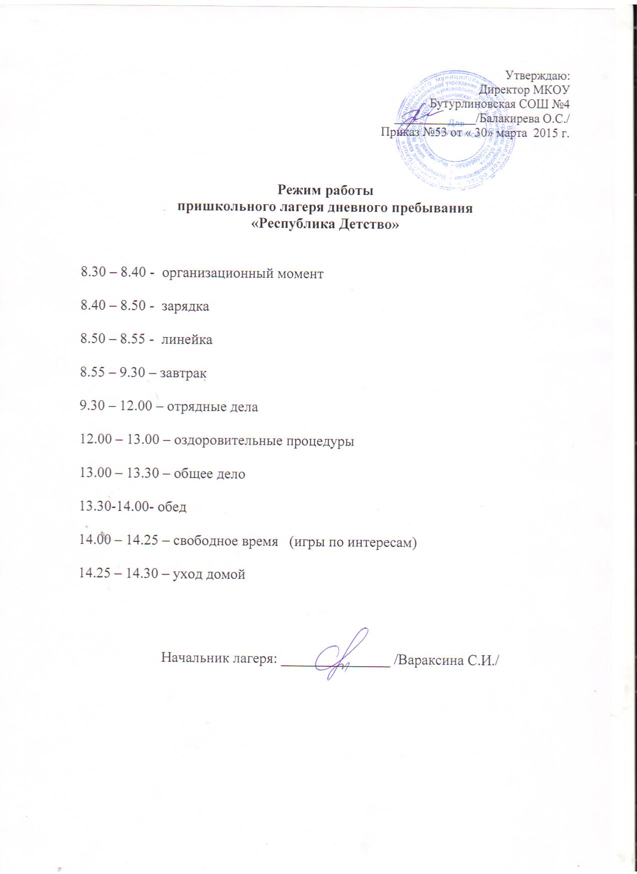 Начало работы лагеря с 1 июня 2015 по 30 июня 2015,г. с 8.30 до 14.30. Выходные дни –суббота, воскресенье, 12 июня.